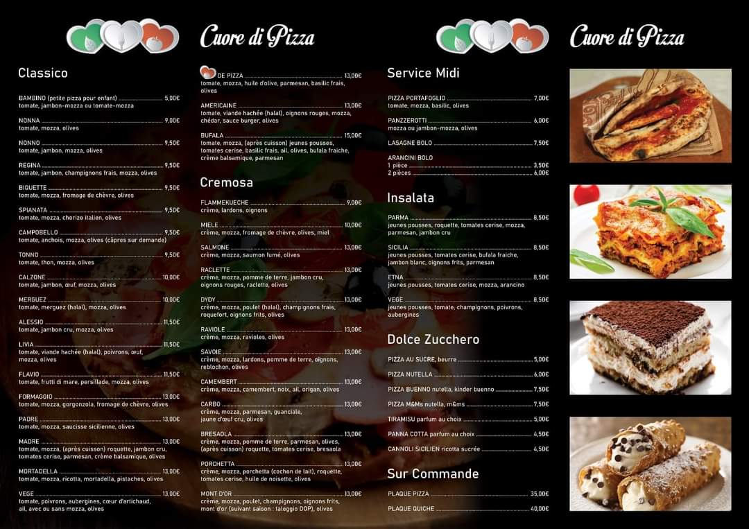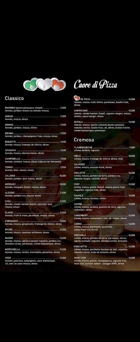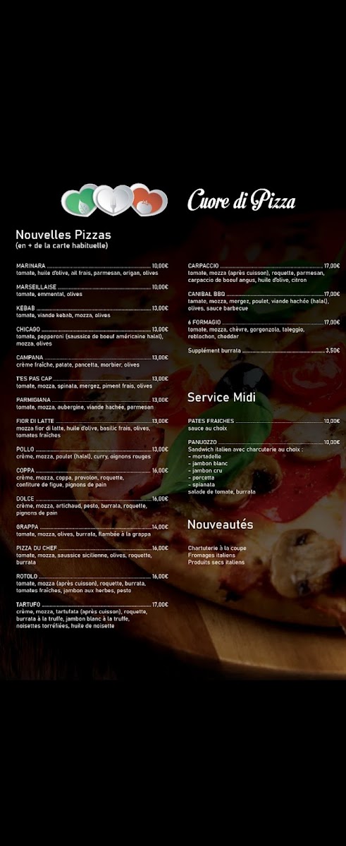 Introducing the menu of CUORE DI PIZZA, a delightful pizzeria located in Crolles, France. This charming eatery has quickly garnered rave reviews for its lightning-fast service and delectable offerings. Customers like Sean Ryan and Atharva Phadke emphasize the speed and quality of the pizzas, ensuring a satisfying experience with every visit.
